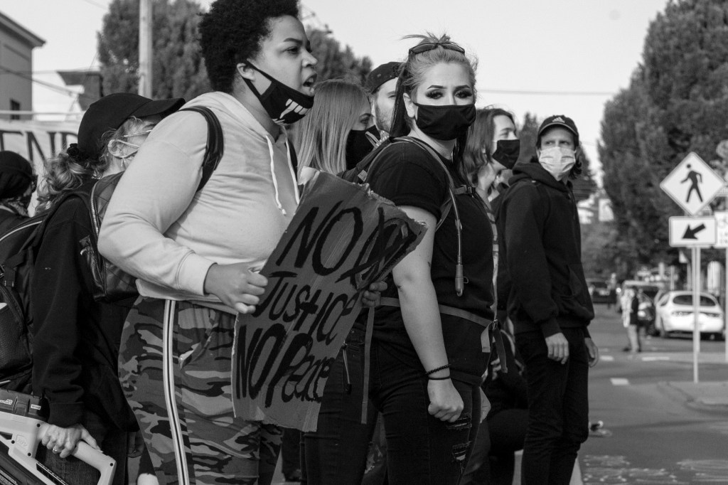 Every Monday I take a long walk throughout Olympia. I had reached the downtown area and was ready to go home when I saw them on the next block. They had protested the previous 2 days but both protests were at night. I had my Nikon Df with me so I went over and shot some images. At first they were wary of me but became more comfortable as the march progressed and stopped at City Hall.
