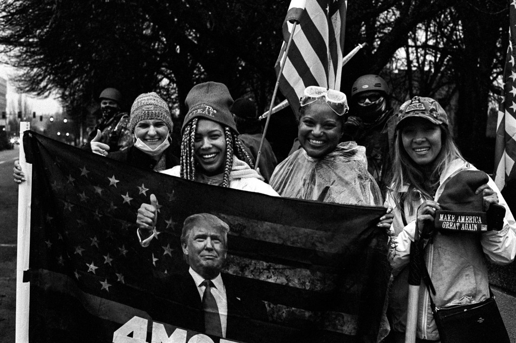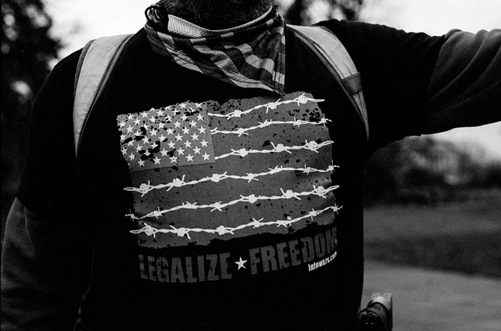 Last Saturday it was rainy and dark. I had my Nikon F4 with me, loaded with 400TX. The conditions necessitated me pushing the film two stops. I wanted to see if there was a protest at the Capitol and driving by I saw a group of about 50 people. I parked nearby and was able to get some images. They were a diverse group, supporters of President Trump, upset with the election results, the government shutdowns, and liberal policies being introduced into the public schools. I developed the film in HC-110(B) for 6 minutes.