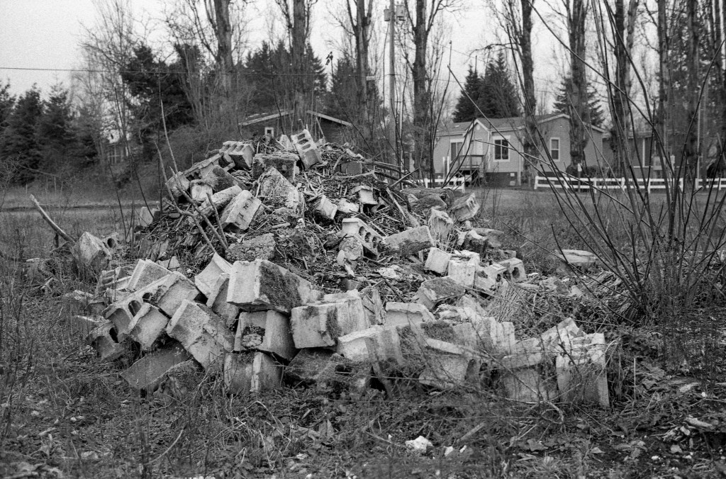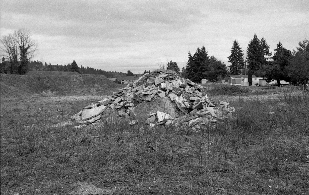 I received last week 3 rolls of black and white film from Lomography. Besides the Potsdam Kino 100 shown in these images, I now have a roll of Babylon Kino, with an ISO rating of 13, and a roll of Fantome Kino, with an ISO rating of 8. I will wait for a bright sunny day for those films. These images were shot at a future shopping complex in Centralia named Centralia Station. Many homes were removed to accommodate the project. Now, as you pass the property, you will see mounds of debris leftover from their removal. The project is several years behind, and I will not be surprised if I return in a year and find the area unchanged.