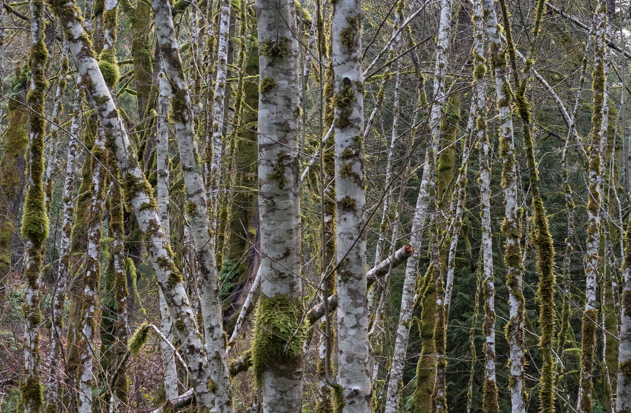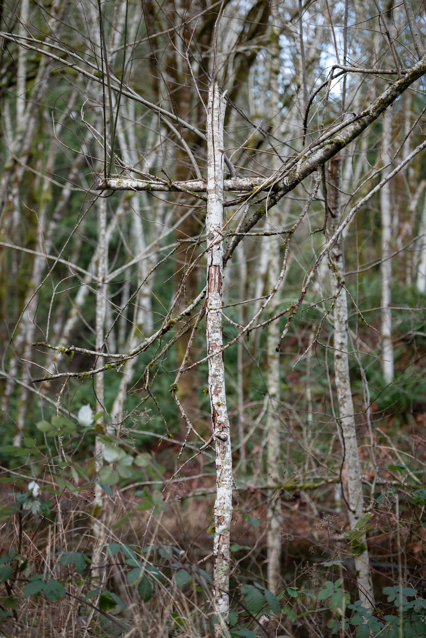 Red Alder has thin, gray bark often with patches of white lichens. Because of the whitish appearance of the bark, it is often confused with Paper Birch (https://nativeplantspnw.com/red-alder-alnus-rubra/)