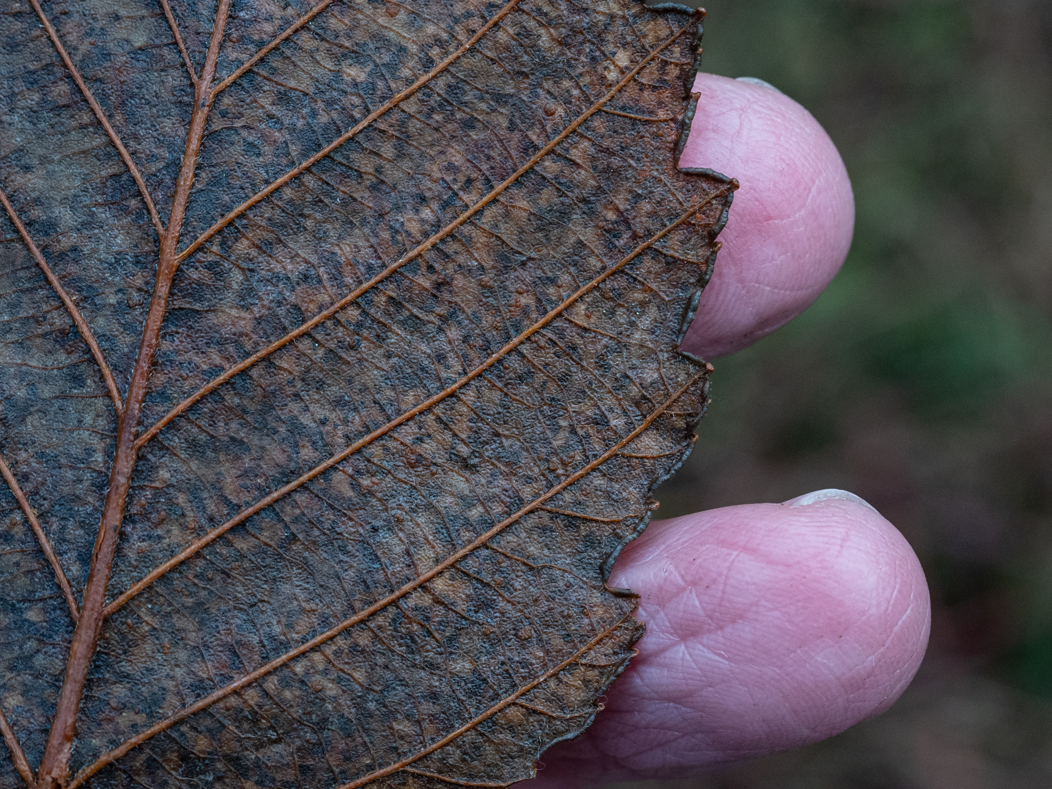 Here are images of the top and bottom of the leaf. Note how the edges are rolled (revolute) over on the bottom of leaf below. This is the easiest way for me to identify the tree from other alders (https://uwbdr.uwb.edu/wetland/plants/alnus-rubra)